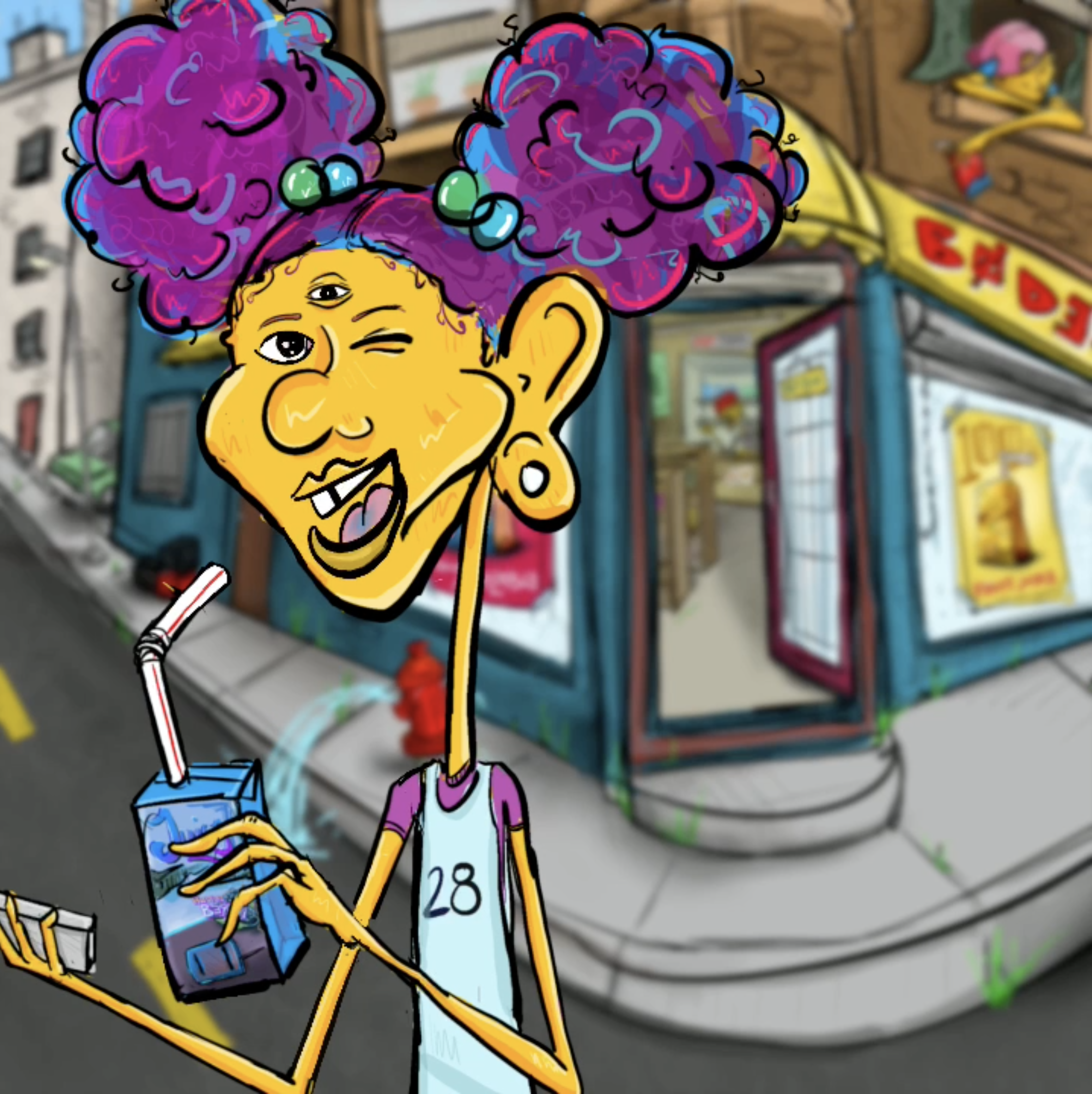 The Bodega is an animated NFT that parodies a television commercial for a juice-box like kids might see while watching cartoons. The products marketed to lower-income Black communities are often foods and drinks of little nutritional value which merely satisfy hunger and thirst, while upper income communities have a passport to healthy options.